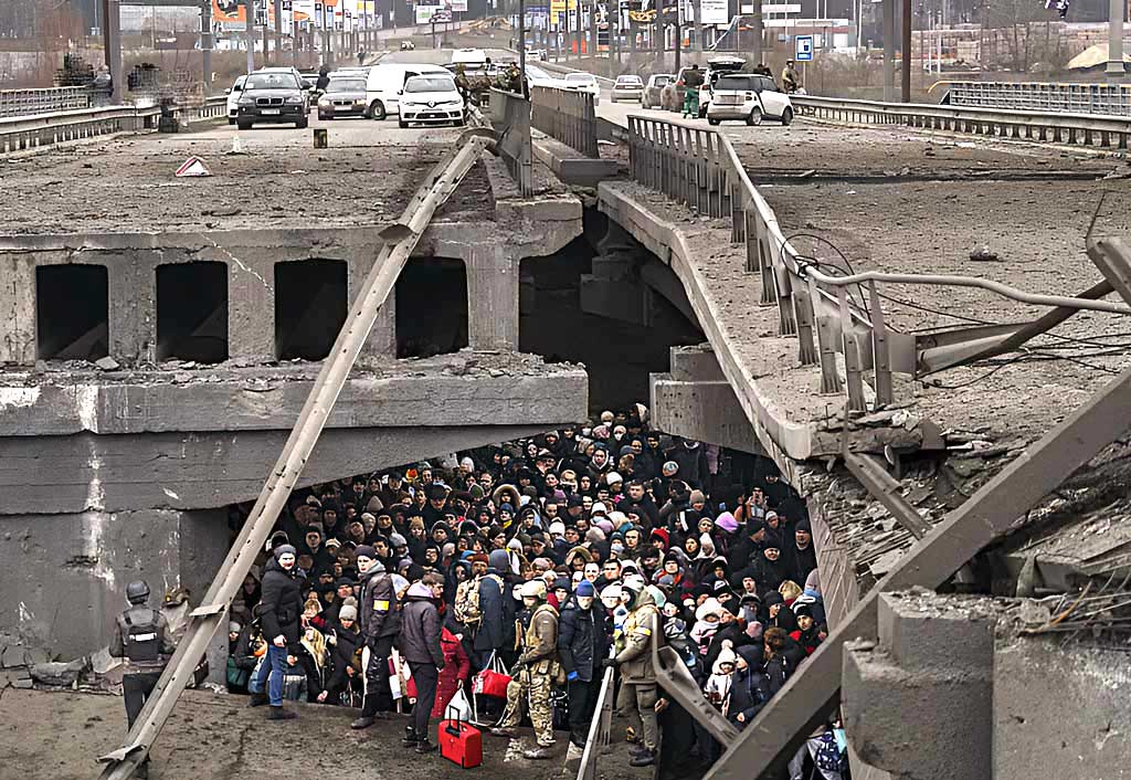9 días después de la invasión rusa a Ucrania Bajo un puente destruido en el río Irpin, a las afueras de Kiev, decenas de ucranianos se protegen mientras intentan huir. Es 5 de marzo de 2022, nueve días después de que Vladimir Putin ordena la invasión rusa. Los misiles caen, las tropas avanzan y Europa vuelve a escuchar el eco de una guerra a gran escala. Familias enteras esperan su turno para cruzar entre escombros, con niños en brazos y el miedo tatuado en el rostro. La guerra sigue abierta, y esta imagen encarna la fragilidad humana frente a la devastación. Más de 25.000 civiles ucranianos han muerto y cientos de miles de soldados de ambos bandos han perdido la vida. (AP foto/ Emilio Morenatti).